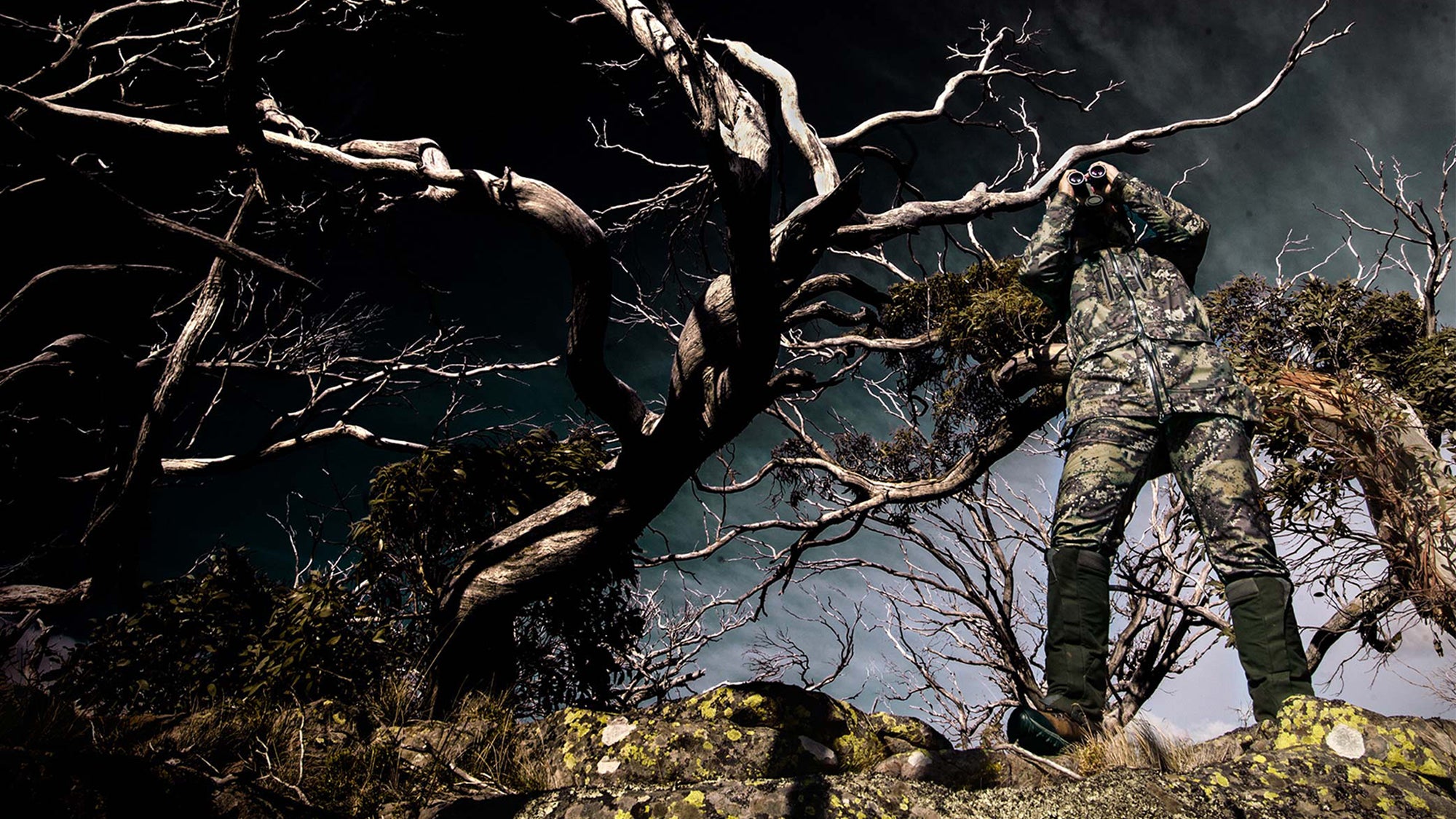 In early 2014 our curiosity sent us down a path of research and development that lead to the creation of Desolve Camouflage, a pattern designed to fool animals, not hunters. Our research highlighted the massive problems with current “sticks and leaves” styles of camouflage. Ungulates (hooved animals) don’t see the way we do, instead their vision is blurrier so they don't focus on detail, instead they have been trained to focus their attention on outline. A new style of camo that breaks up this outline with large macro and micro shapes creates the illusion of depth, so the subject appears to be a series of small objects spread out across a range of distances. Desolve Camouflage was developed and tested in the field over the course of hundreds of hours to manipulate the specific colour and light tones most prominent to ungulates and the results are simply astonishing.