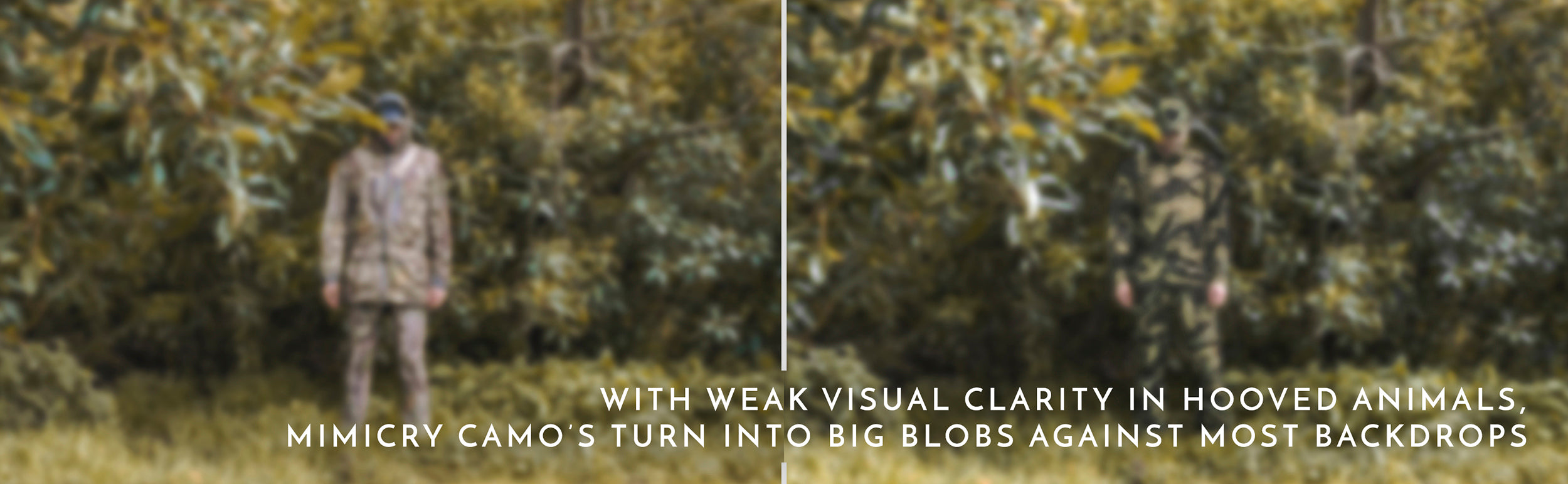 The majority of the hunting camouflage scene is saturated with what we can call “mimicry” patterns. These use pictures or photos of sticks, leaves, bark, trees, etc. These mimicry patterns naturally look the best to the human eye. Because our vision is so much sharper than that of ungulates, we interpret the detail as matching that of the environment it is meant to mimic. Unfortunately, as discussed above, this is the wrong approach to take when trying to fool a deer. Although we see this fine detail, the ungulates do not. With their cloudier vision, they perceive these sticks and leaves as blobs of blurry colour. So they will see a bush on a hillside as a green blob, or a twig as a brown bar. They will see these mimicry camo patterns as big brown blobs as well as they these patterns only use low contrast, micro patterns. So unfortunately all that nice detail in the camo is lost on a deer. What they do see then is a brown blob with a defined outline, just as we would if we were to look at another hunter dressed in a solid brown jersey. Disruption is therefore the key to fooling ungulates into not seeing us. Disruption in camouflage terms refers to breaking up this vitally important outline. Disruption will in essence trick the animals eyes into not recognising the subject as one single object. Instead it will use different sized patterns to create the illusion of depth. To the animal it will look as though one part of the pattern is a small object 50 meters away, and another part of the pattern is a small object 200 meters away, for example. Based on the science behind their vision, this will be a far more effective and logical approach than trying to trick them into believing that one big object is something that it is not. In essence, mimicry camo tries to trick the animal to believe that the subject is something that it isn’t, where disruption camo tricks the animals eyes into not seeing any subject at all.