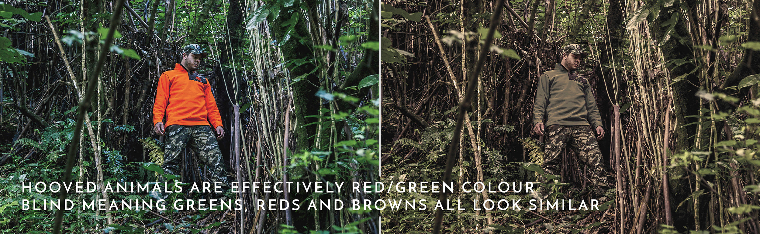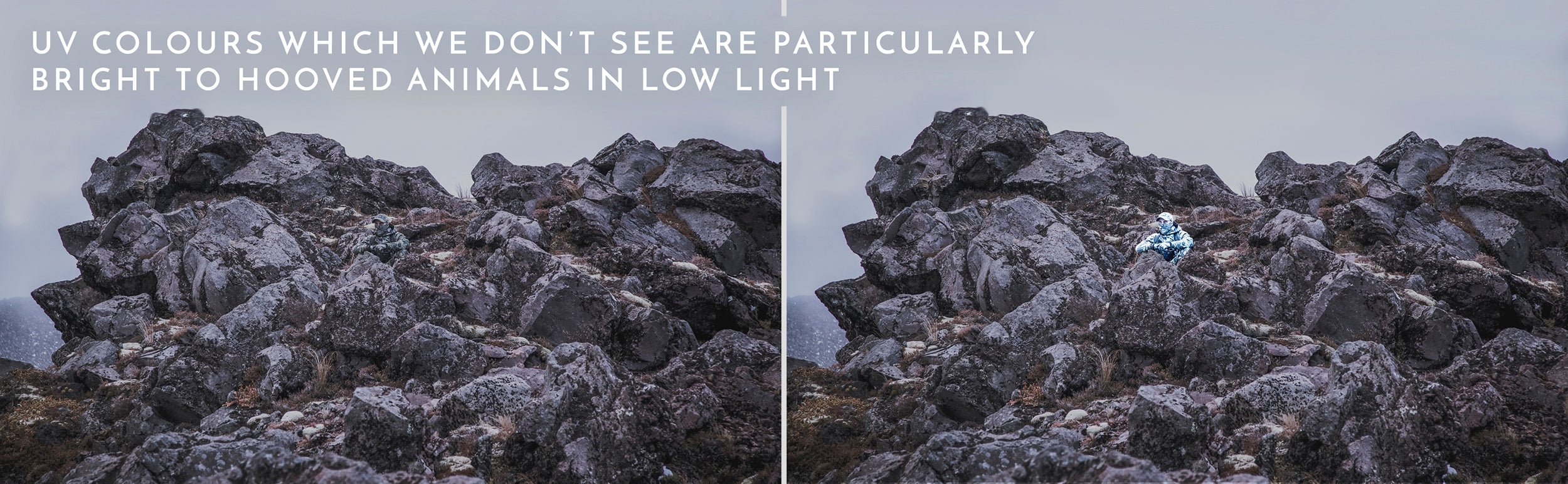 UV light can most easy be thought about from our perspective as a type of glowing light. The Human eye has a built in filter which blocks out about 99% of UV light. If that filter wasn’t in our eyes we would see some short-wave length colours stand out from the crowd like something shiny reflecting in the sun light. The best example we can see of UV light is when looking at neon paints or bright white T-Shirts that glow in nightclubs under black lights. Ungulates do not have this filter covering their eyes, meaning these colors in the UV spectrum glow a lot brighter, especially in low light conditions. This UV glow doesn’t naturally occur very often in the natural environment. A lot of modern dyes and laundry products used in the creation and washing of hunting clothing contain color brighteners which in fact are UV enhancers. As a lot of hunting clothing manufacturers are unaware of this and this may be why experienced hunters will often swear to have had more success at getting close to deer in their old “worn in” hunting clothes.