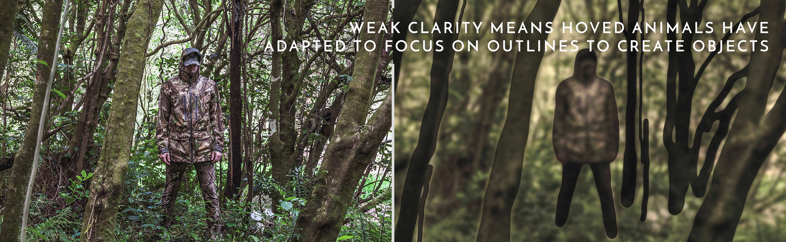 The main thing that we really need to know though is that both the detail and clarity are reduced in ungulate vision compared to human vision. The easiest way to think of this is to imagine that deer see a slightly blurry image, as if they need glasses. Now because of this they identify their potential threats based primarily on outlines and shapes. They are hard wired to identify harsh outlines of objects and symmetry in these outlines. So for example a tigers silhouette has a sharp outline too it compared to a broken up bush with thousands of small leaves. Also the tiger facing front on to the prey will also have a nice symmetrical shape to it. Both of these elements set off a warning signal to the prey. Now this is probably the most important point when we think about camouflaging ourselves from our prey. This tells us that the detail and realism of the leaf and stick shapes in the camouflage pattern aren’t actually very important as they aren’t able to be clearly defined by an ungulate anyway. What is important, is our outline!