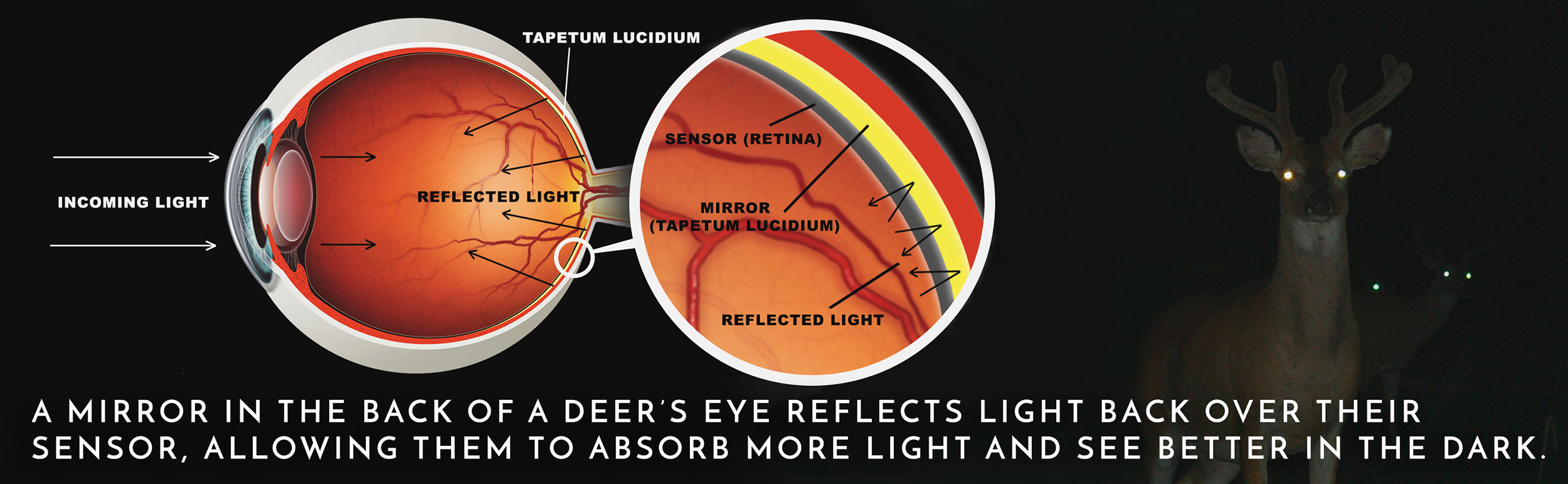 Because of this process deer and most other hooved animals have far greater night vision than humans. This Tapetum Lucidum layer has probably evolved to give prey animals the ability to feed at night under the cover of darkness when their predators are in bed. Unfortunately for the prey however it seems that most of their natural predators, big cats, dogs etc, have evolved to keep up and now see just as well in the dark.